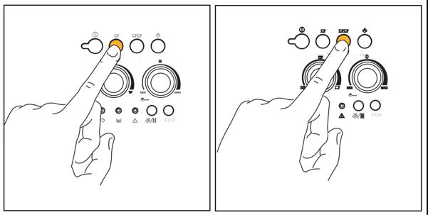 Step 2: Bắt đầu khởi động máy bằng nút on/off trên bảng điểu khiển của máy. Bạn sẽ thấy đèn chọn 1 tách và 2 tách sẽ nhấp nháy, bạn chờ đến lúc nào 2 đèn ngừng nhấp nháy, lúc này máy pha đã sẵn sàng hoạt động.